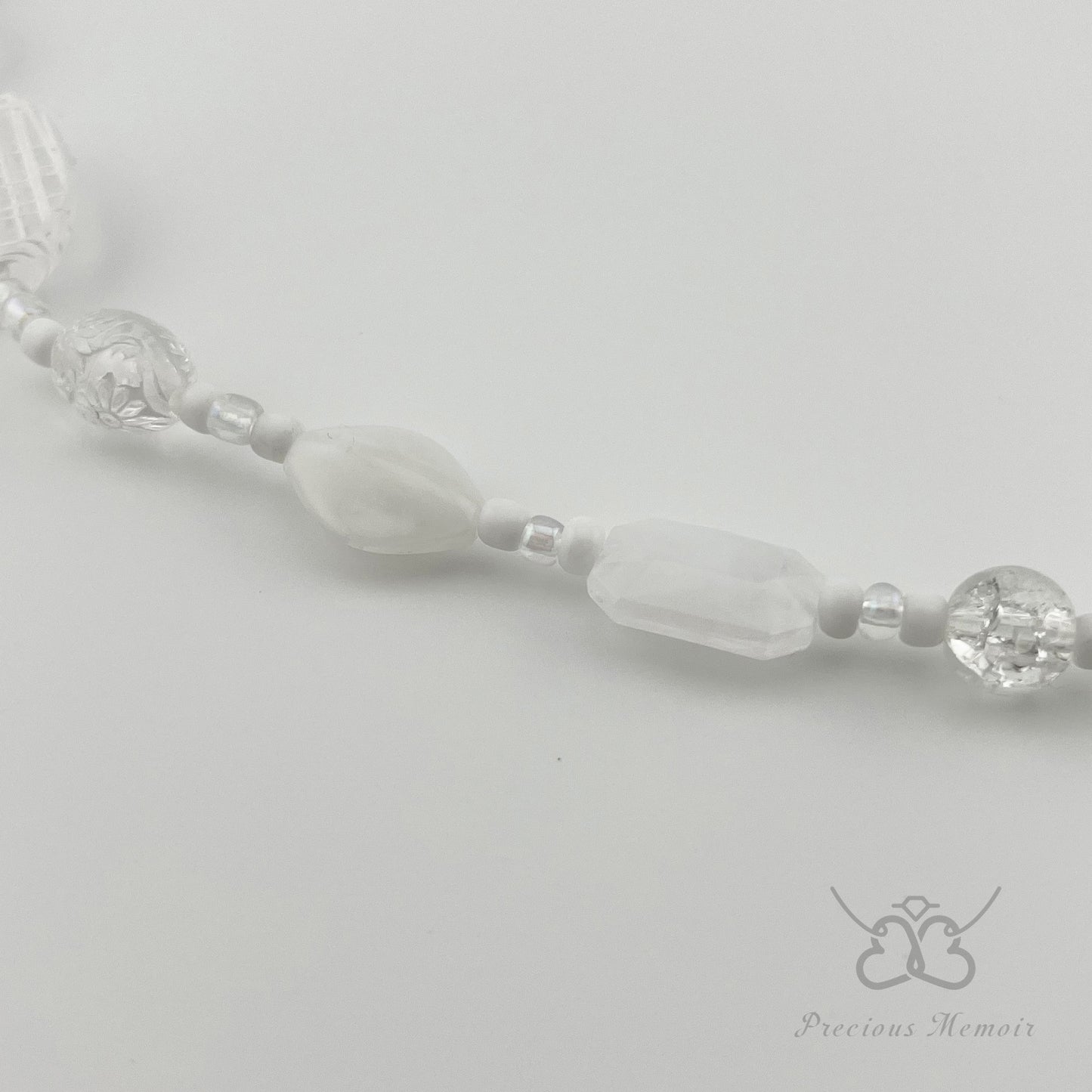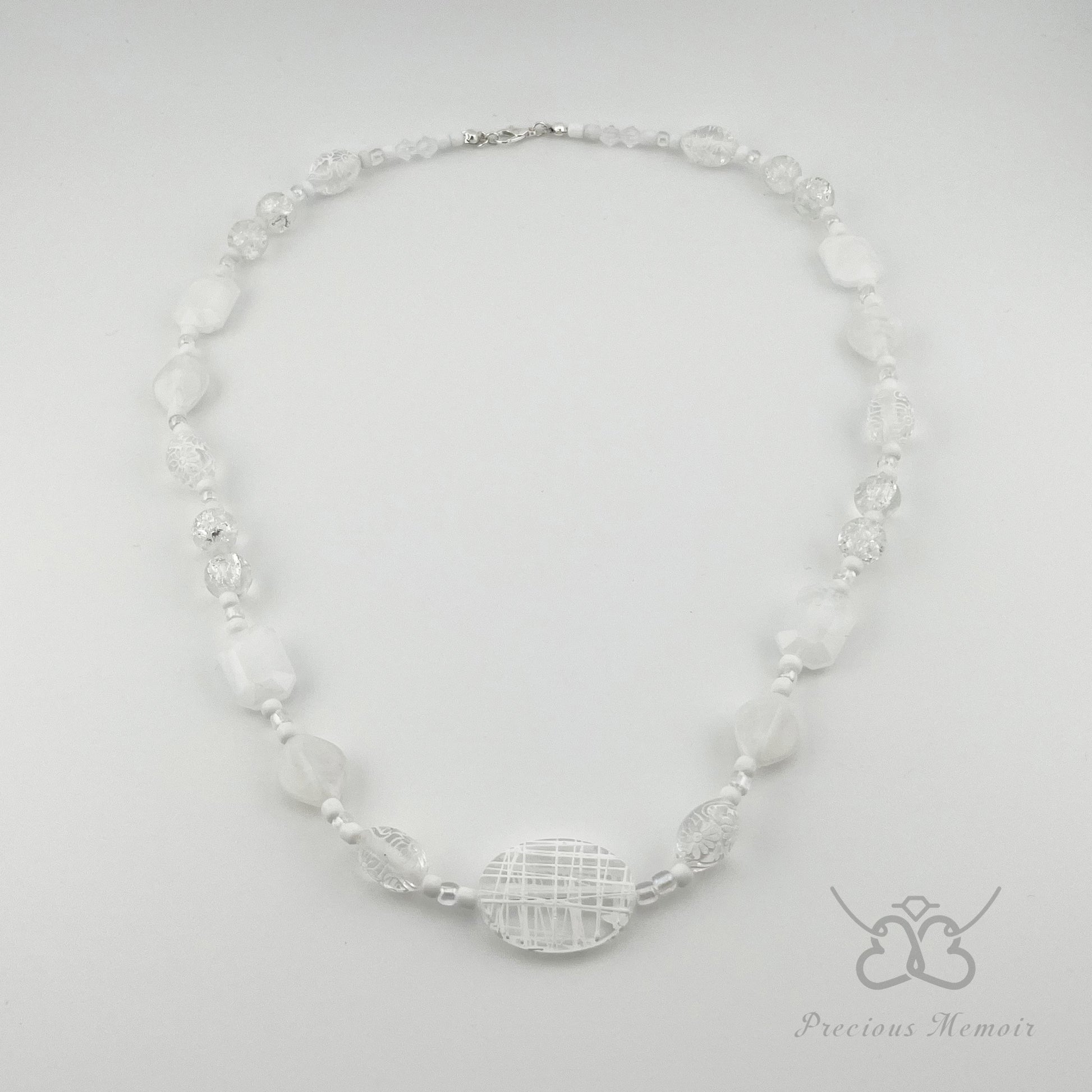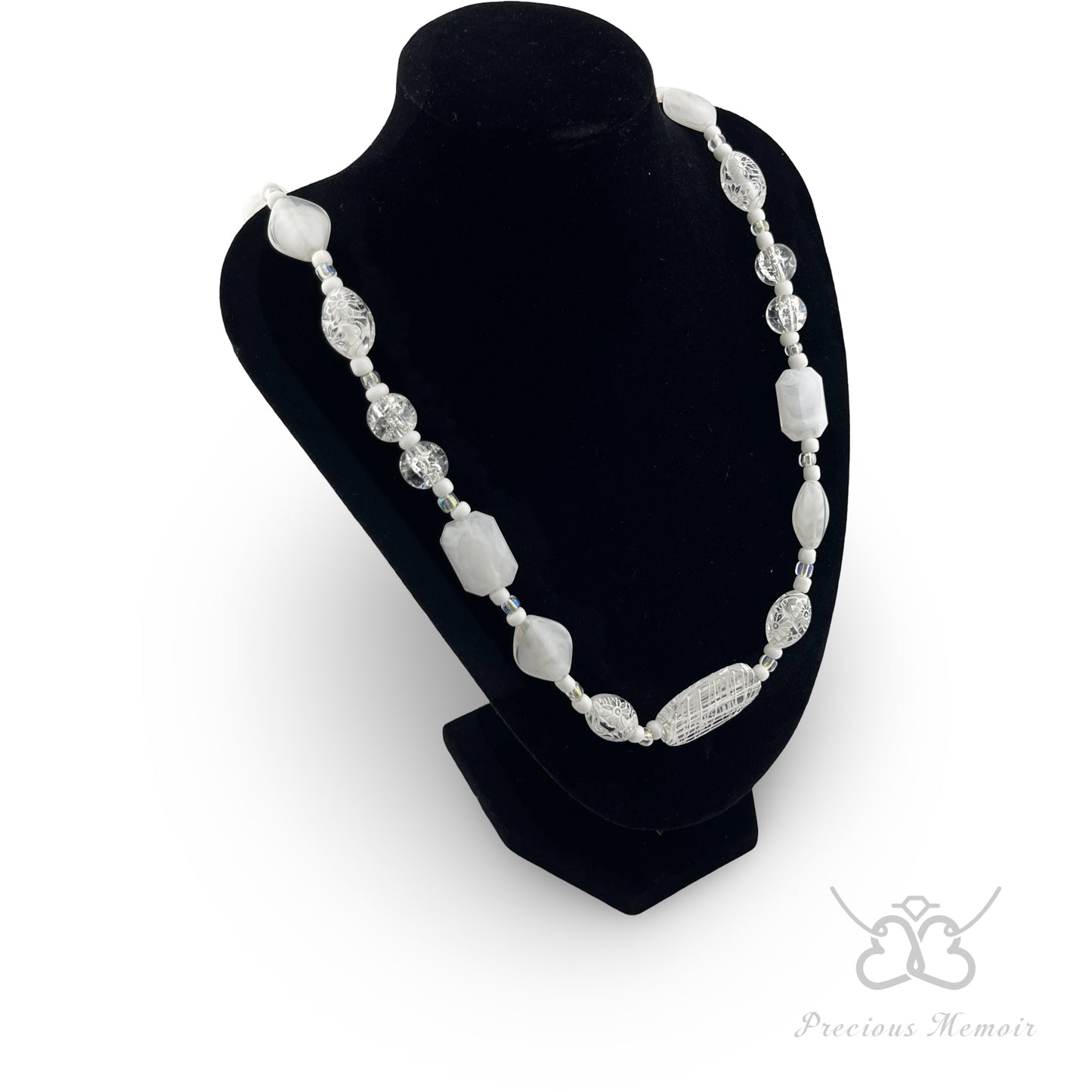 White Bead Necklace w/ Clouded Gems & Etched Flower Design